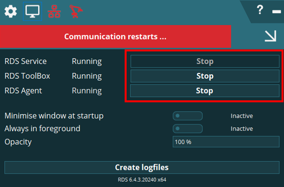If the RDS Service will not Run (image here shows running), the "Stop" button will read "Start". If when you press "Start" RDS does not start, then an uninstall and reinstall of RDS may be necessary.