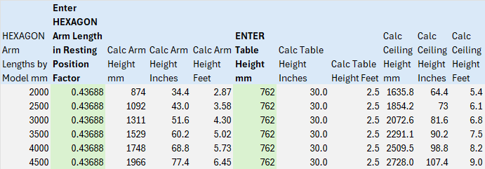 HEXAGON Arm Lengths by Model mm | HEXAGON Arm Length in Resting Position Factor | Calc Arm Height mm | Calc Arm Height Inches | Calc Arm Height Feet | Table Height mm | Calc Table Height Inches | Calc Table Height Feet | Calc Ceiling Height mm | Calc Ceiling Height Inches | Calc Ceiling Height Feet |