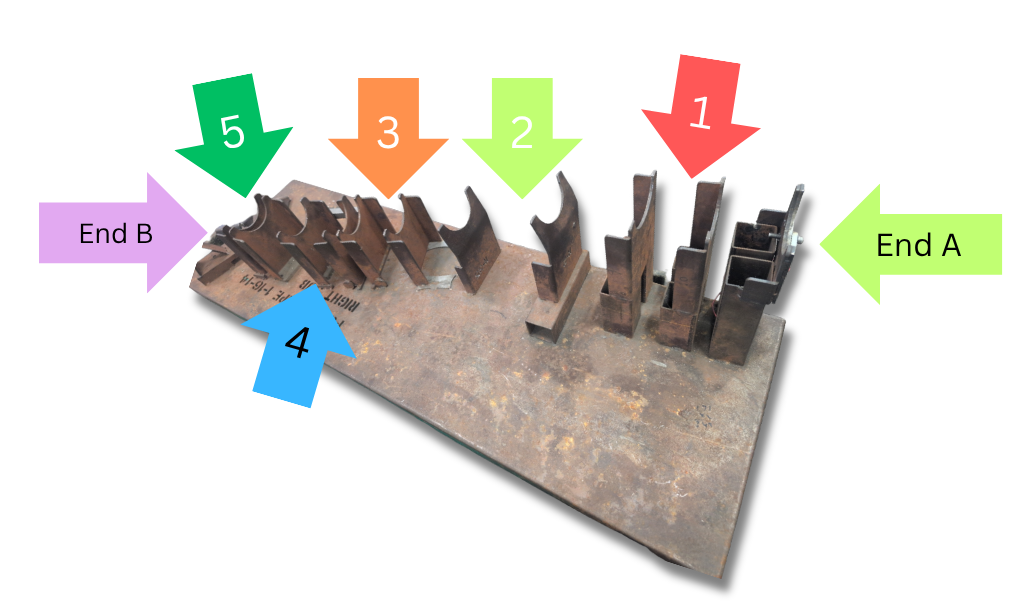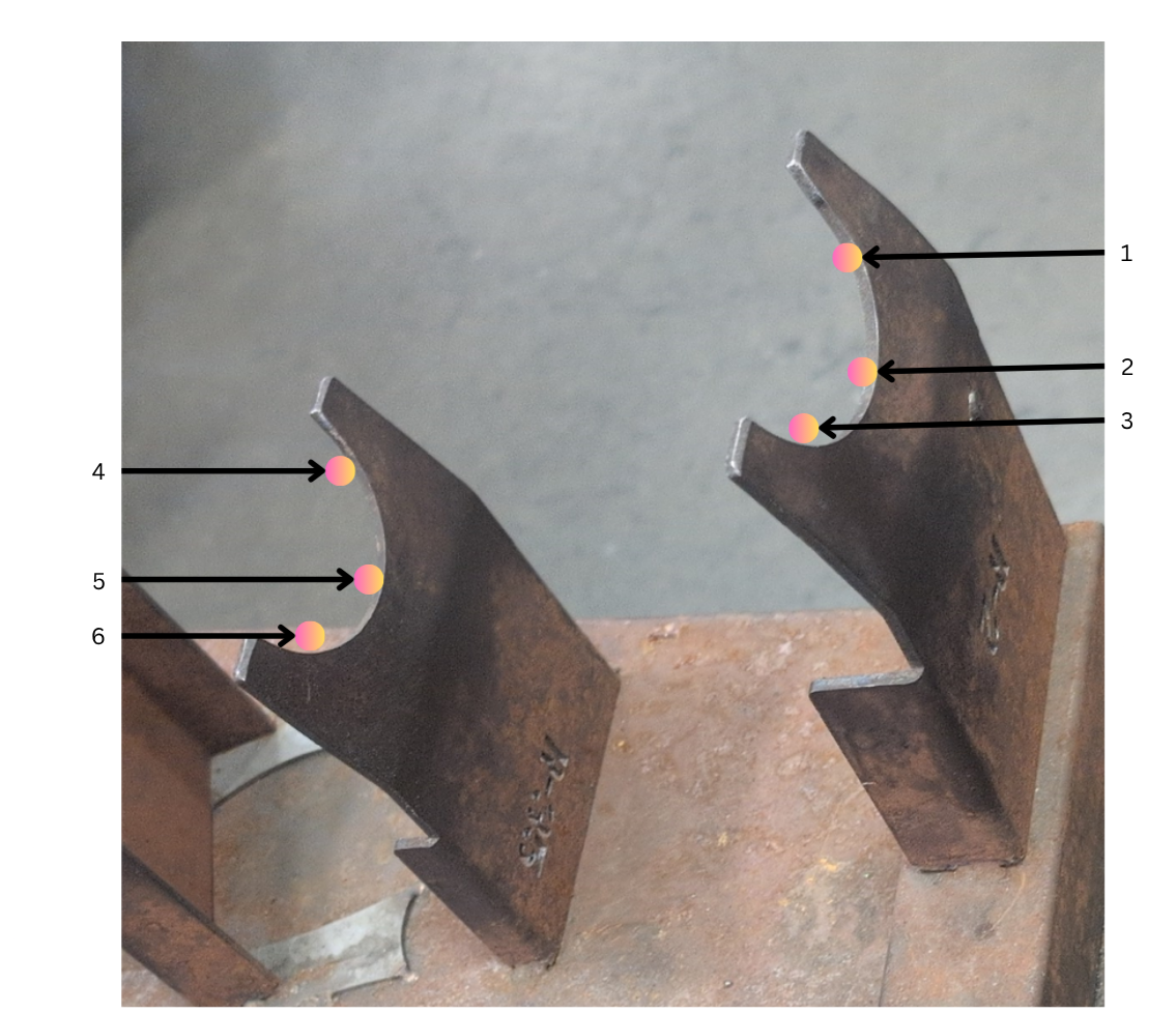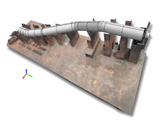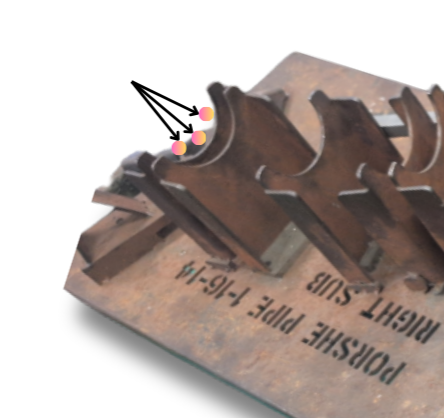 Now measure each straight section like this: This fixture has two arc seats per straight. To measure the centerline of this fixture, measure 6 points in a straight, then press the Accept button. Repeat this for all the straights. Be sure the sections you measure represent the reverse of a tube diameter. (VTube-LASER does not handle conical yet - so different diameters on either end of the sections will not measure.) It is ok to take more than 6 points - but 6 points are the minimum required. | ![]() |