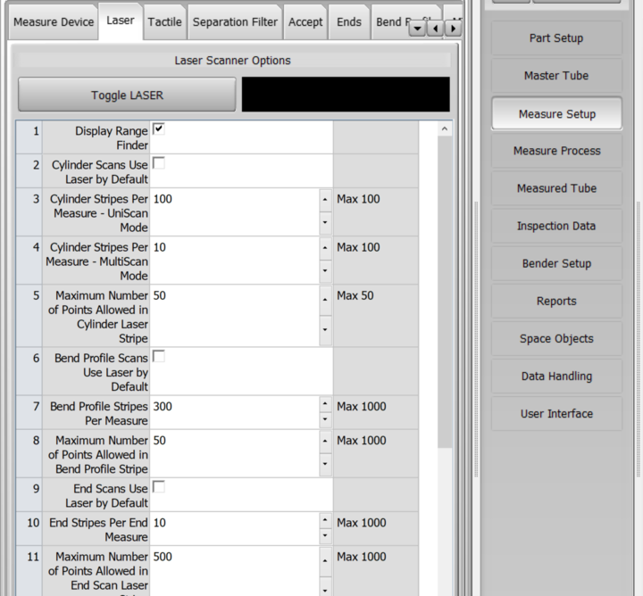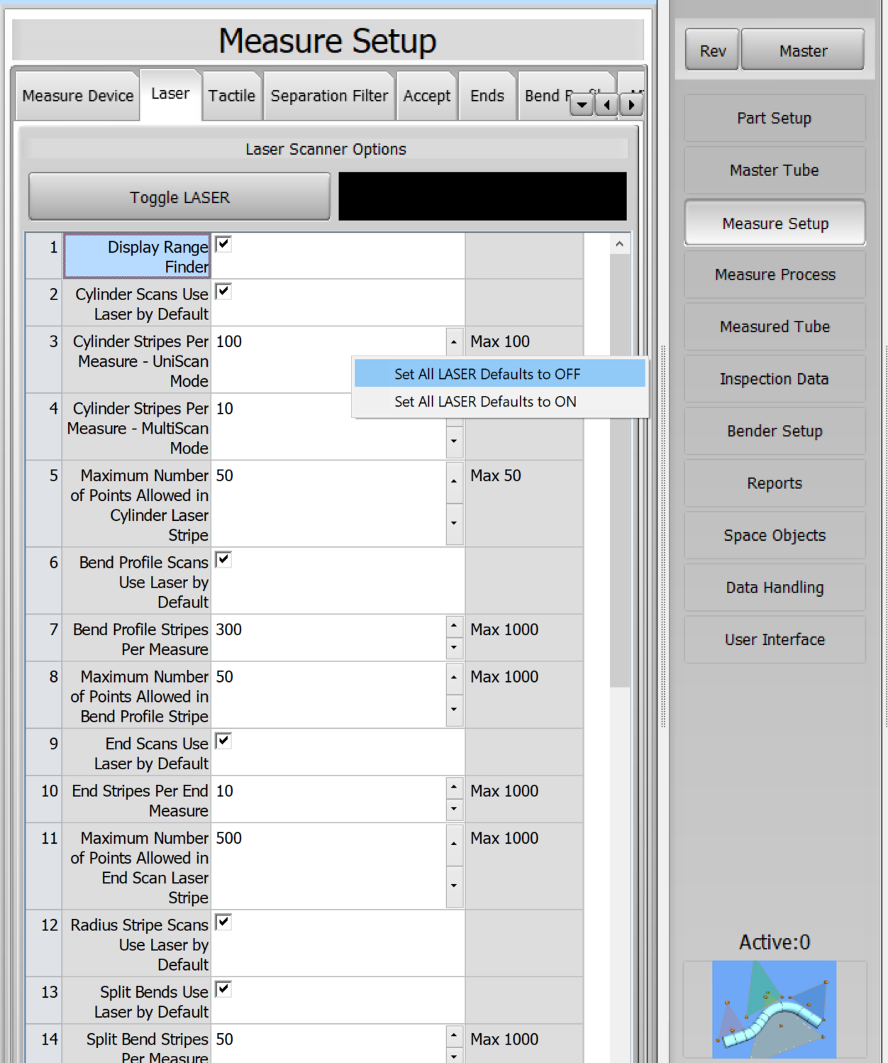 Set VTube-LASER so that the LASER is OFF for all measurements in the Measure Setup>LASER menu. Right-click on the LASER menu and choose "Set All LASER Defaults to OFF." | ![]() |
