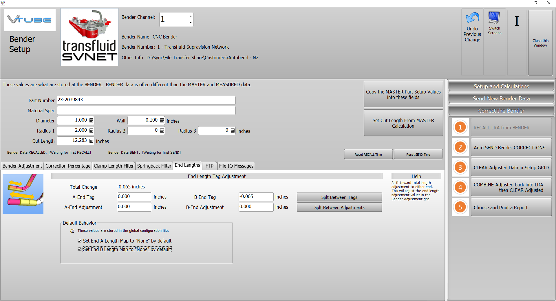 Bender Setup has a renamed "End Length" tab menu that includes two checkboxes, allowing users to automatically ignore the first and last end length corrections when setting up Bender Setup for the first time on any project. The values are stored in the global configuration file.